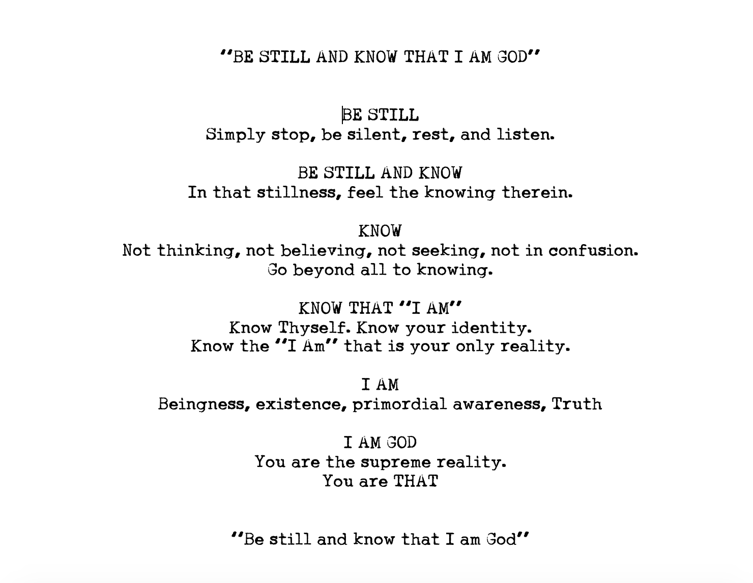 “Be Still And Know That I Am God” Posted on May 6, 2021May 6, 2021 by Balthazar (Psalm 46:10) There are gems hidden within the Old Testament.Powerful sutras that strike to the heart of Truth.And one sentence contains the wisdom of a thousand spiritual tomes. Share! Click to email a link to a friend (Opens in new window) Email Click to share on Facebook (Opens in new window) Facebook Click to share on Reddit (Opens in new window) Reddit Click to share on Pinterest (Opens in new window) Pinterest Click to share on X (Opens in new window) X Like Loading... Related